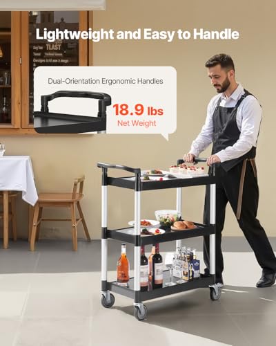 VEVOR Utility Cart, 300 lbs Load Capacity, 3-Tier Utility Plastic Cart with 360° Swivel Wheels (2 with Brakes), 24.4 x 16.1-inch Food Service Cart for Warehouse, Office, Home, Restaurant, Kitchen