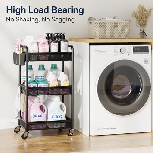 YASONIC 3 Tier Rolling Cart – Metal Utility Storage Cart with Wheels, Craft Cart Organizer with Hanging Cups, Hooks, Mesh Basket for Bedside Kitchen Office Art, Black
