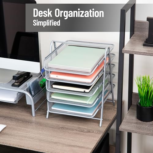 Each of the five spacious tiers fits standard 8.5″ x 11″ paper and most notebooks, while the sleek metal mesh construction blends seamlessly with any home, office, or classroom décor. Rubber feet keep the unit stable and prevent scratches on your desktop, and a built-in handle makes it easy to carry from room to room. Whether you’re organizing work tasks, school projects, or everyday paperwork, this organizer brings structure and simplicity to any setting.