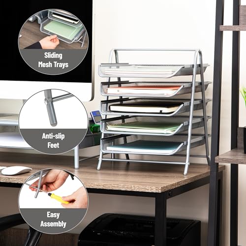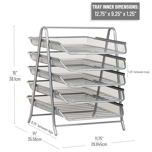 Mind Reader 5-Tier Paper Tray Organizer, Vertical Desktop File Storage Rack, Office, Metal Mesh, Silver