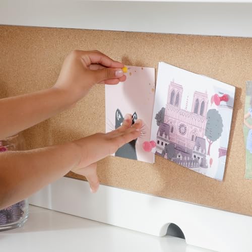 COMPLETE SET INCLUDES STORAGE HUTCH : Features multiple shelves, cord cutouts for computer or tablet chargers and a corkboard for pinning pictures, art projects and more